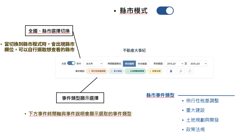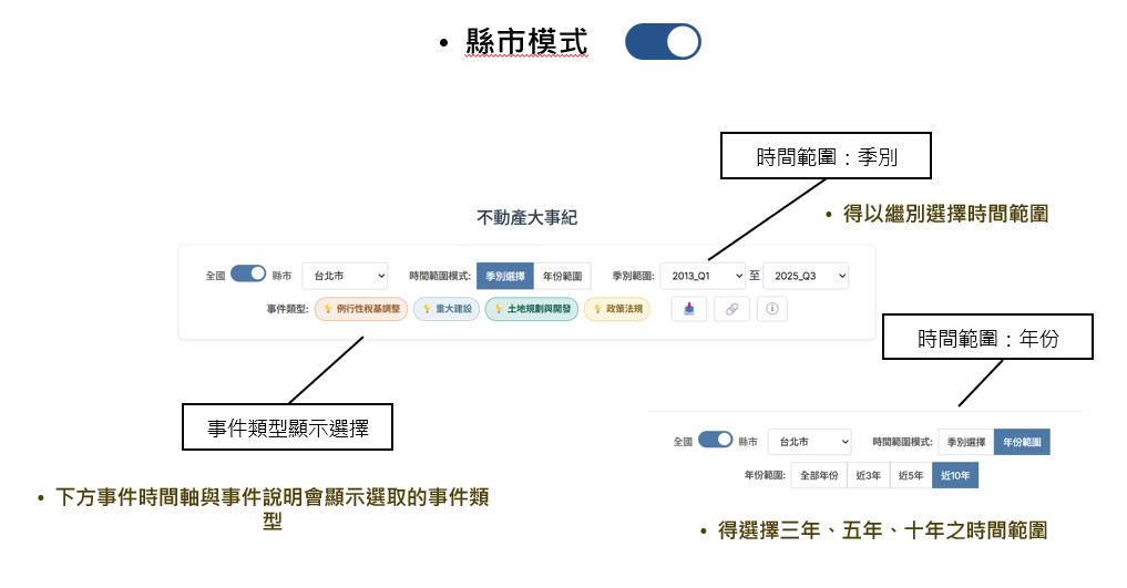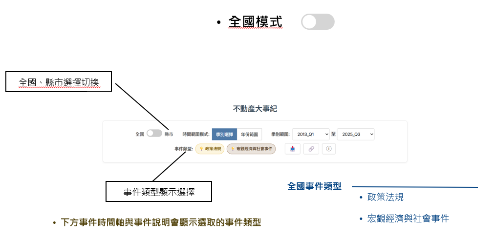 以下為不動產大事紀查詢網站使用教學示意,引導您利用「不動產大事紀」儀表板,查詢房價趨勢與相關事件。