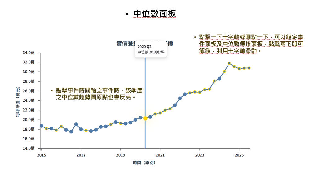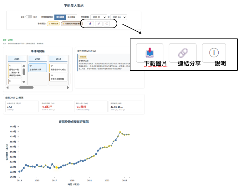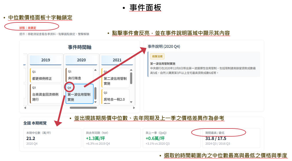 點擊事件後,「事件說明區域」會顯示其詳細內容,同時該季度的房價中位數、YoY (年增率)、QoQ(季增率)也會在單價價格面板中顯示。 |